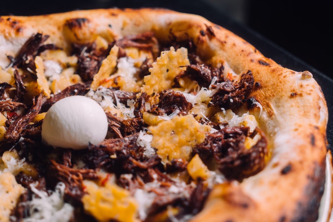 Pequeña pizza frita y al horno con pulled pork casero, mayonesa de jalapeño, queso filatino, salsa de queso cheddar, salsa barbacoa y patatas crunchy